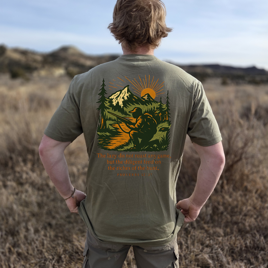This comfortable tee features the verse from Proverbs 12:27, serving as a reminder of the importance of hard work and dedication. Whether you're hunting or seeking spiritual fulfillment in everyday wear, this tee is a statement piece for any hunter who values their faith. Embrace your love for the great outdoors and your commitment to your beliefs with this stylish and meaningful tee, this tee is sure to become a go-to favorite in your wardrobe.