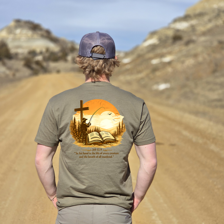 Set against a warm wilderness sunset, the cross stands tall over an open Word — a reminder that faith and creation are never separated. From the mountains to the forests, all of it is in His hand.